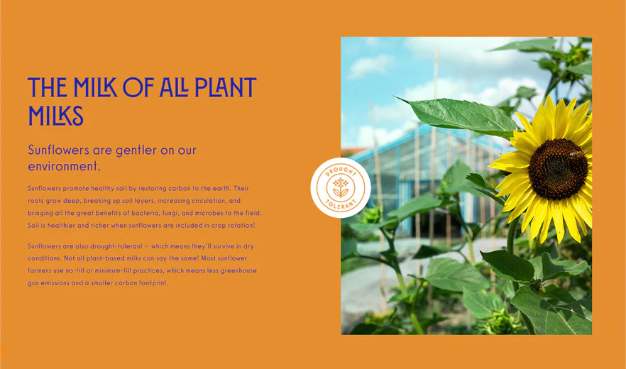 Sunflowers emit less carbon dioxide than other kinds of milk, and they're safe for those who are vegan or vegetarian because they contain no animal products. Sunflower seeds are also loaded with healthy fats and protein, as well as antioxidants like Vitamin E and copper! So your body will thank you too—and so will your taste buds!