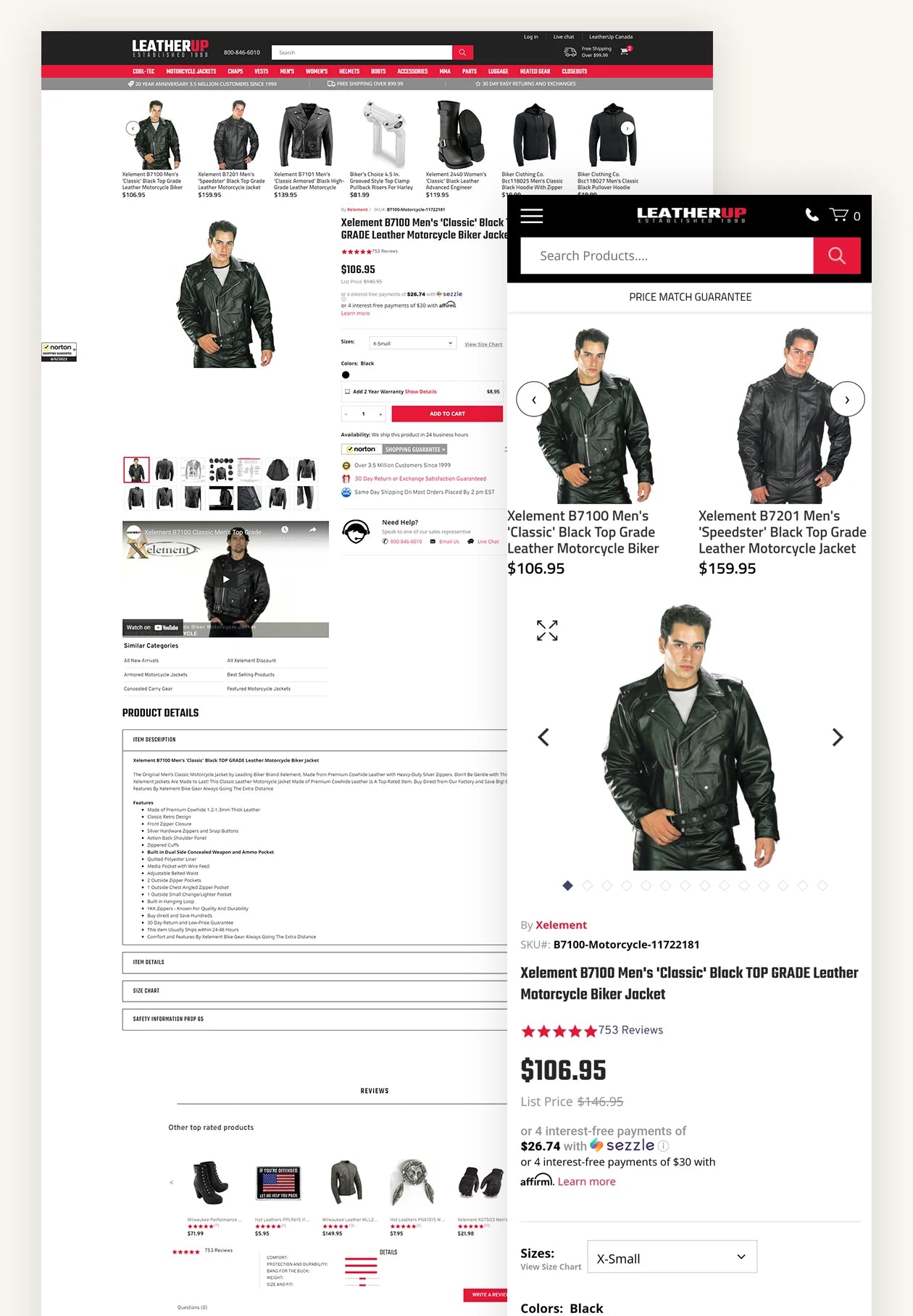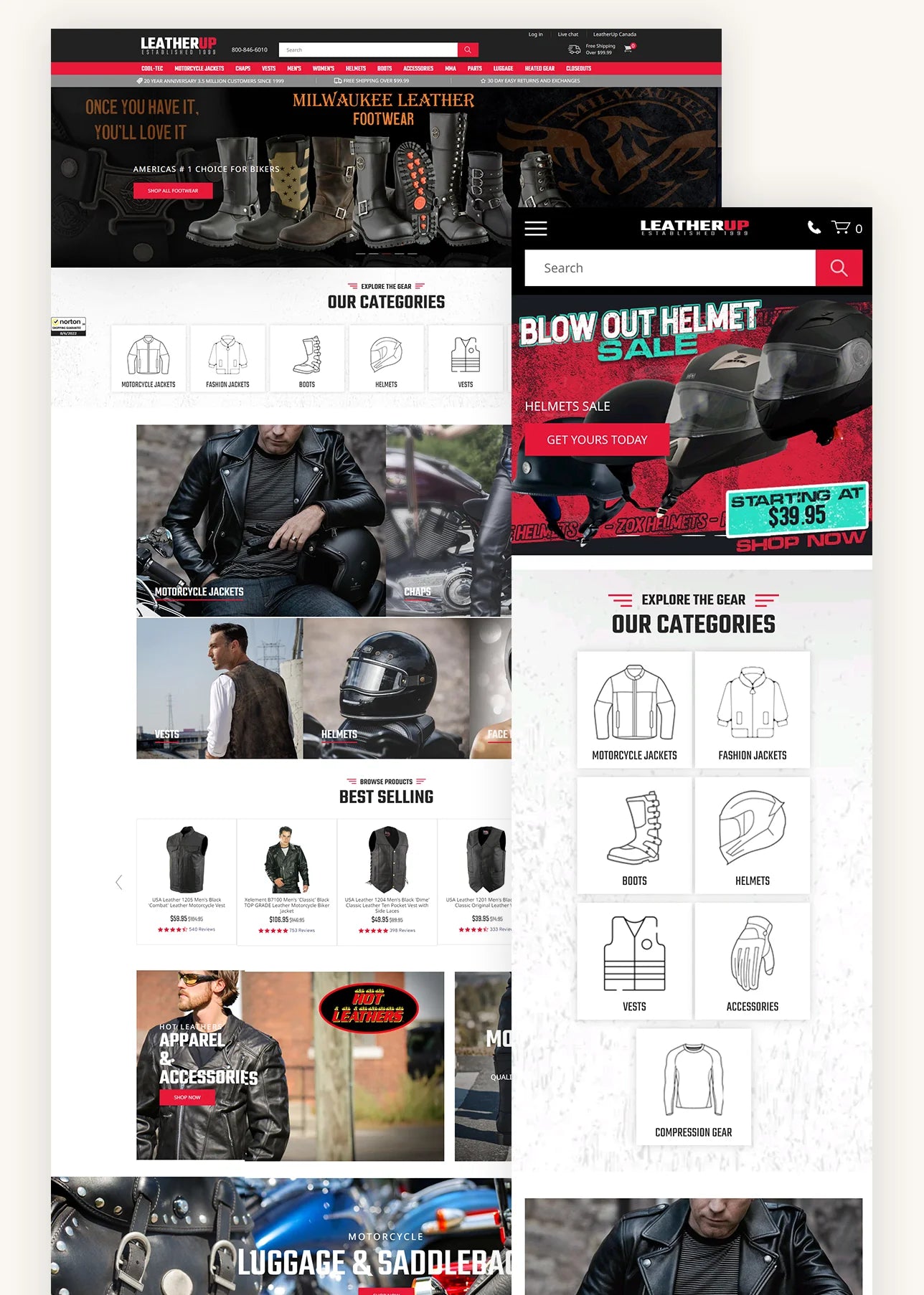 As part of our work with LeatherUp, we were tasked with creating both a new brand and an entirely new store for their e-commerce presence. We worked closely with the team at LeatherUp to make sure that the brand was a perfect reflection of their values and vision for the future. LeatherUp is a thriving company that provides high-quality motorcycle and fashion products to millions of consumers worldwide. They have grown exponentially over the last few years, and they are now looking to migrate their store to Shopify Plus. To accompany this growth, they wanted a complete redesign of their entire online presence.