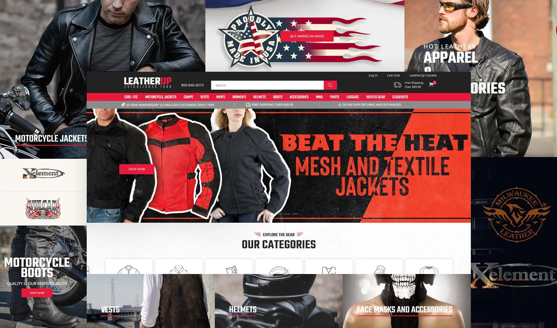 The LeatherUp homepage is a powerful tool for ecommerce, but it wasn't always that way.When we got started, their old homepage was cluttered with text and links, which made it hard to find the products you were looking for. The result? Visitors clicked away without buying anything.So we took a fresh look at their website and found ways to improve their home page experience so that visitors could quickly find what they wanted and get out of there—with a smile on their faces!We redesigned the site with a focus on punchy graphics, top collections, all categories and best-selling products. We also added a sticky header and announcement banner that highlights free shipping, the return guarantee and 3.5 million users since 1999!