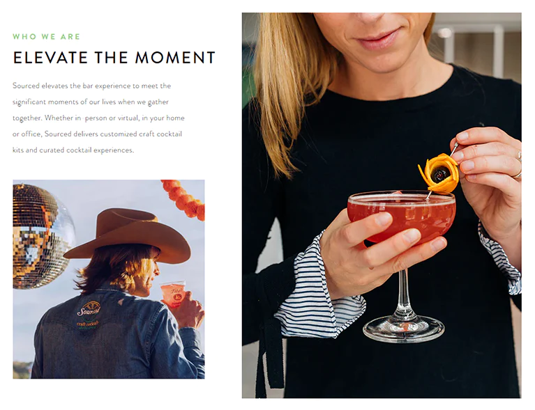 The former website for Sourced Craft Cocktail did not sufficiently convey the standard of excellence and expertise exhibited by their business. As a result, the design team at Webinopoly was tasked with developing a new website design for Sourced Craft Cocktail that reflected the business's unique blend of laid-back and elegant tastes. In order to entice prospective customers, the design featured ample amounts of white space and clean lines, as well as appropriate applications of pops of color and stunning professional photographs of the cocktails.